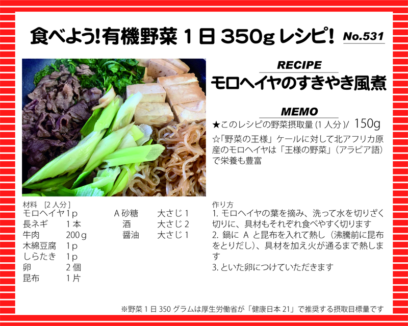 モロヘイヤのすきやき風煮 2025 7/14 モロヘイヤのすきやき風煮 食べよう!有機野菜1日350gレシピ! この記事が気に入ったら フォローしてね! Follow @yuukinokyo Follow Me URLをコピーしました!