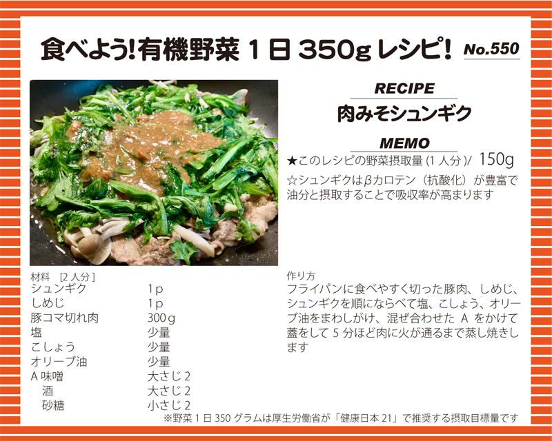 肉みそシュンギク 2025 12/15 肉みそシュンギク 食べよう!有機野菜1日350gレシピ! この記事が気に入ったら フォローしてね! Follow @yuukinokyo Follow Me URLをコピーしました!