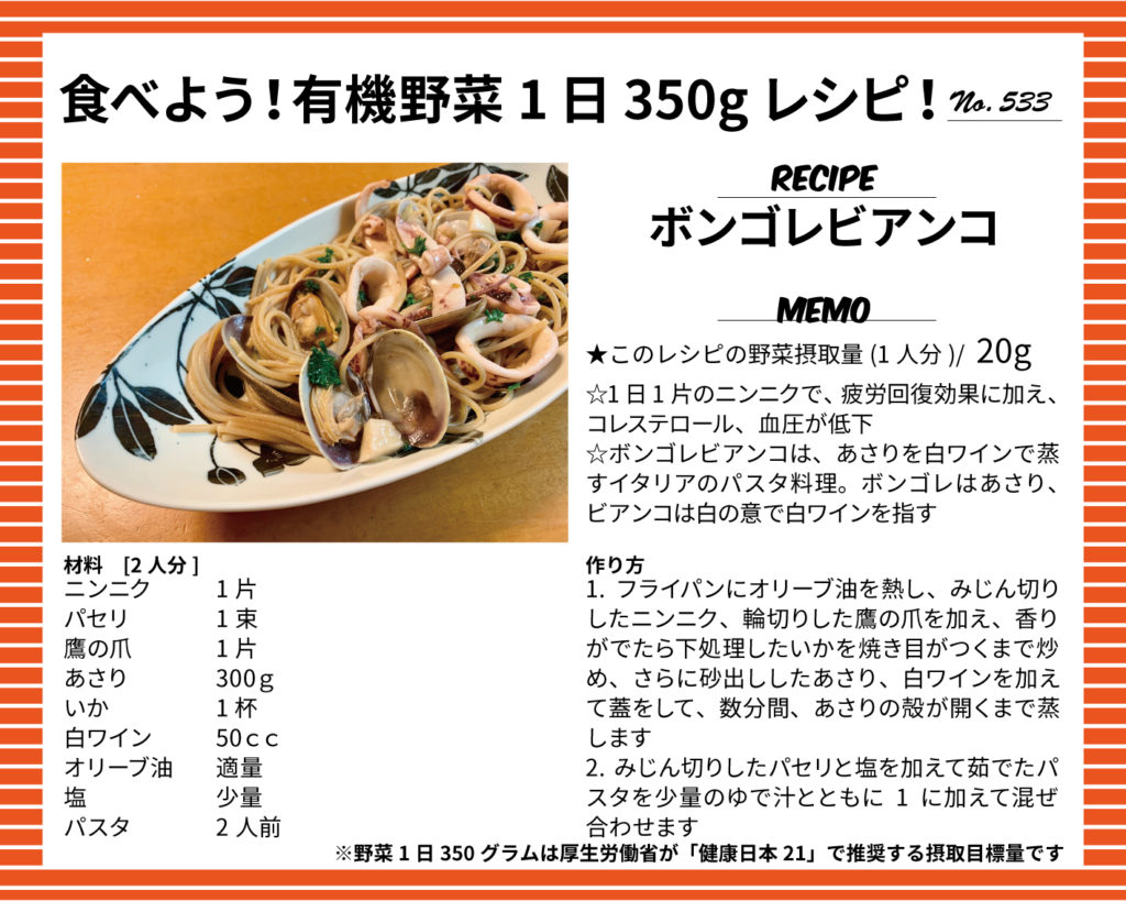 ボンゴレビアンコ 2025 8/18 ボンゴレビアンコ 食べよう!有機野菜1日350gレシピ! この記事が気に入ったら フォローしてね! Follow @yuukinokyo Follow Me URLをコピーしました!